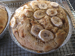 Made a regular cake batter but used canola oil in place of hard fat, just 2 large eggs, brown sugar, baking soda & aluminum-free baking powder and whole wheat flour, when the batter was made I added some rice milk and the squishy roasted bananas and their juice ( tons of flavor in the juices)...also added some walnut pieces.